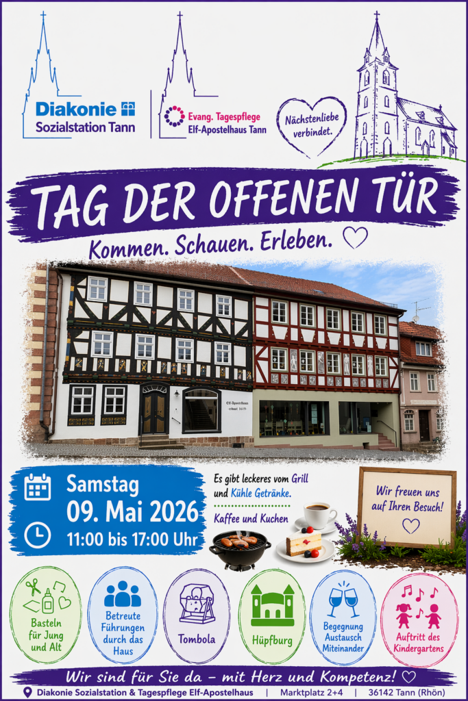 Die Diakonie Sozialstation und die Tagespflege im Elf-Apostelhaus der evangelischen Kirchengemeinde Tann (Rhön) laden Sie ganz herzlich zu einem Tag der offenen Tür ein.